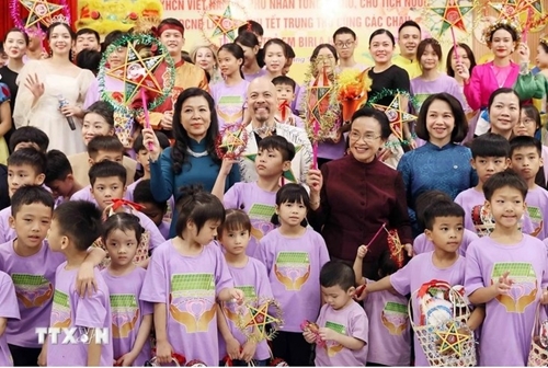 ທ່ານນາງ ນາລີ ສີສຸລິດ ແລະທ່ານນາງ ໂງເຟືອງລີ ເຂົ້າຮ່ວມລາຍການຕ້ອນຮັບວັນບຸນໄຫວ້ພະຈັນ ພ້ອມກັບເດັກໆ. ພາບ: ສໍານັກຂ່າວສານຫວຽດນາມ |