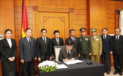 ສະຫາຍ ທອງລຸນ ສີສຸລິດ ເລຂາທິການໃຫຍ່, ປະທານປະເທດ ແຫ່ງ ສປປ ລາວ ເຂົ້າຮ່ວມພິທີໄວ້ອາໄລເຖິງດວງວິນຍານຂອງສະຫາຍ ເຈິ່ນດຶກເລືອງ ອະດີດກໍາມະການກົມການເມືອງສູນກາງພັກ, ອະດີດປະທານປະເທດ ແຫ່ງ ສສ ຫວຽດນາມ. ພາບ: ສໍານັກຂ່າວສານຫວຽດນາມ. |