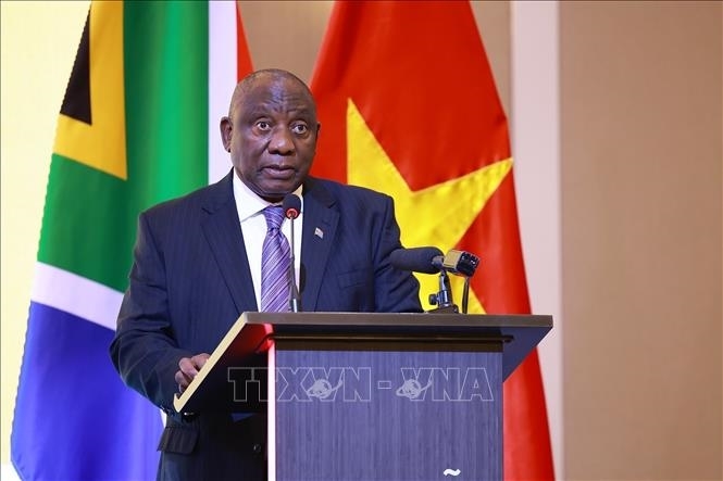 ທ່ານ Matamela Cyril Ramaphosa ປະທານາທິບໍດີ ອາຟະລິກາໃຕ້ ກ່າວຄຳເຫັນທີ່ເວທີປາໄສວິສາຫະກິດ ຫວຽດນາມ-ອາຟະລິກາໃຕ້. ພາບ: ສໍານັກຂ່າວສານຫວຽດນາມ |