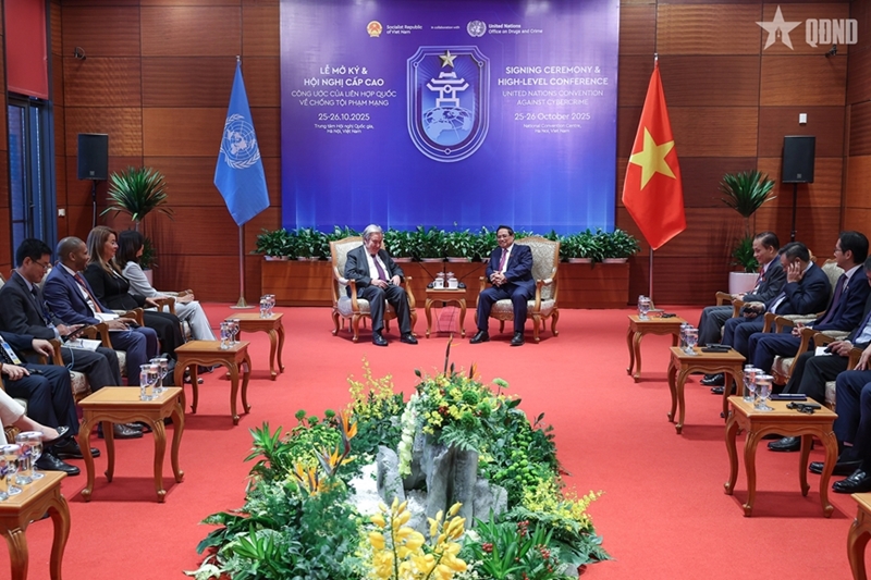ກປ.ອອນໄລ - ຕອນບ່າຍວັນທີ 25 ຕຸລາ, ທີ່ສູນປະຊຸມແຫ່ງຊາດ, ທ່ານນາຍົກລັດຖະມົນຕີຫວຽດນາມ ຟ້າມມິງຈິງ ໄດ້ພົບປະກັບທ່ານເລຂາທິການໃຫຍ່ ສະຫະປະຊາຊາດ Antonio Guterres ເນື່ອງໃນໂອກາດຢ້ຽມຢາມຫວຽດນາມ ຢ່າງເປັນທາງການ ແລະເຂົ້າຮ່ວມພິທີເປີດການລົງນາມສົນທິສັນຍາ ສປຊ ວ່າດ້ວຍການປ້ອງກັນ, ຕ້ານອາດຊະຍາກຳທາງໄຊເບີ.