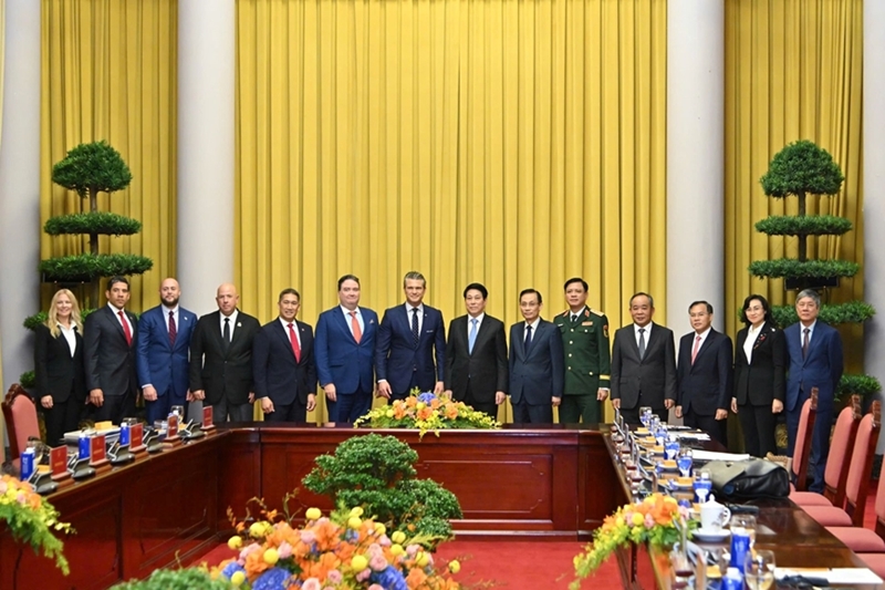 ທ່ານ ເລືອງເກື່ອງ ປະທານປະເທດຫວຽດນາມ ແລະທ່ານ Pete Hegseth ລັດຖະມົນຕີກະຊວງສົງຄາມອາເມລິກາ ພ້ອມດ້ວຍບັນດາຜູ້ແທນທີ່ການຕ້ອນຮັບ. ພາບ: ສໍານັກຂ່າວສານຫວຽດນາມ |