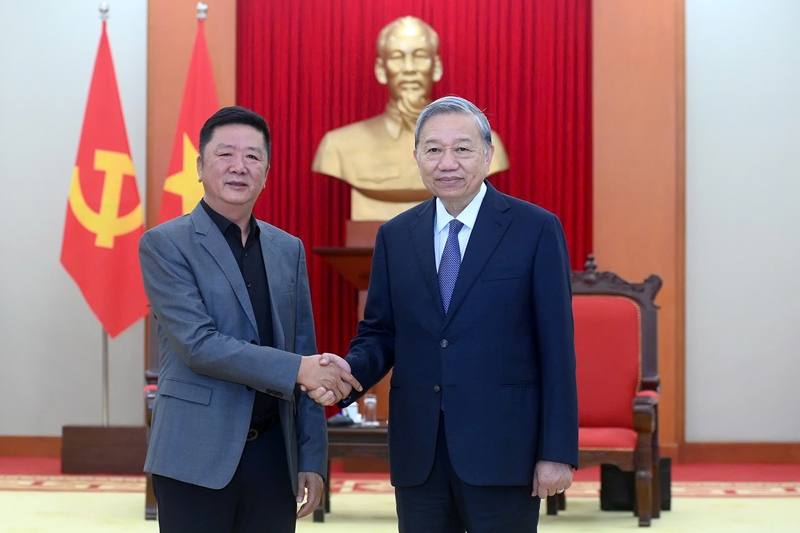 ທ່ານເລຂາທິການໃຫຍ່ ໂຕເລິມ ຕ້ອນຮັບທ່ານ wang lai sheng, ຮອງປະທານກຸ່ມບໍລິສັດ Luxshare-ICT, ຈີນ. ພາບ: ຄວາກຽນ |