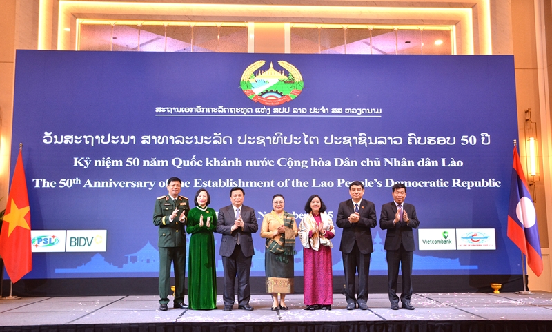 ການນຳພັກ ແລະລັດຫວຽດນາມ ພ້ອມກັບທ່ານນາງ ຄຳເພົາ ເອີນທະວັນ ເອກອັກຄະລັດຖະທູດລາວ ປະຈຳ ຫວຽດນາມ ແລະຄະນະຜູ້ແທນເຂົ້າຮ່ວມງານລ້ຽງ ສະເຫຼີມສະຫຼອງແຫ່ງວັນຊາດລາວ ຄົບຮອບ 50 ປີ ຈັດຢູ່ສະຖານທູດລາວ ປະຈຳຫວຽດນາມ ໃນວັນທີ 26 ພະຈິກ. ພາບ: ຫວູຮວ່າງ |