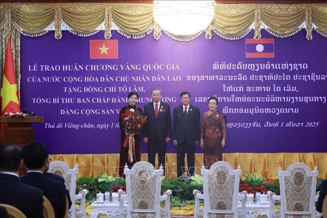 ທ່ານ ທອງລຸນ ສີສຸລິດ ເລຂາທິການໃຫຍ່, ປະທານປະເທດລາວ ປະດັບຫຼຽນຄຳແຫ່ງຊາດ ໃຫ້ແກ່ທ່ານ ໂຕເລີມ ເລຂາທິການໃຫຍ່. ພາບ: ສໍານັກຂ່າວສານຫວຽດນາມ |