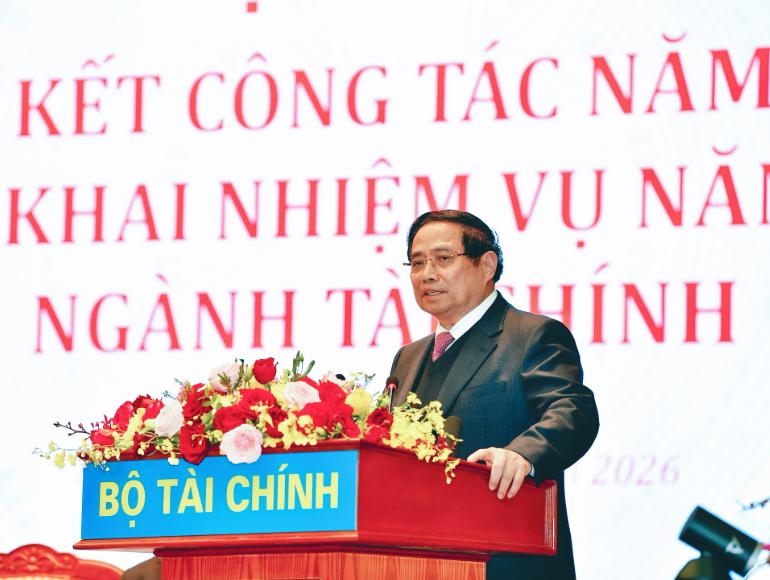ທ່ານນາຍົກລັດຖະມົນຕີ ຟ້າມມິງຈິງ ກ່າວຄໍາເຫັນຊີ້ນໍາທີ່ກອງປະຊຸມສະຫຼຸບວຽກງານປີ 2025, ຜັນຂະຫຍາຍທິດທາງໜ້າທີ່ປີ 2026 ຂອງຂະແໜງການເງິນ. ພາບ: ແທງເຕີມ |