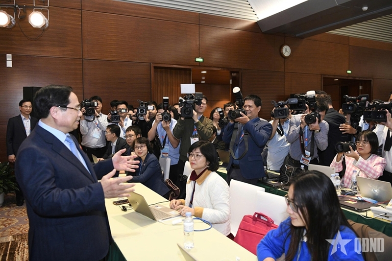 ທ່ານ ຟ້າມມິງຈິ໊ງ ນາຍົກລັດຖະມົນຕີ ລະດົມກໍາລັງໃຈຖັນແຖວນັກຂ່າວ ຢູ່ສູນສື່ມວນຊົນກອງປະຊຸມໃຫຍ່ຄັ້ງທີ XIV ຂອງພັກ. ພາບ: qdnd.vn |