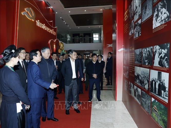 ທ່ານ ໂຕເລິມ ເລຂາທິການໃຫຍ່ ແລະບັນດາຜູ້ແທນຢ້ຽມຊົມສະຖານທີ່ວາງສະແດງຮູບພາບກ່ຽວກັບການເຄື່ອນໄຫວຂອງຄະນະບໍລິຫານງານອົງຄະນະພັກແຂວງກາວບັ່ງ. ພາບ: qdnd.vn |