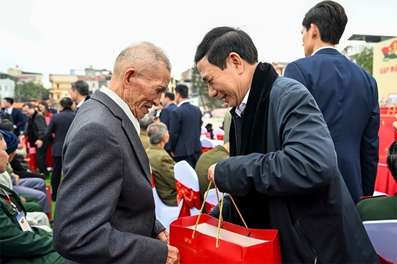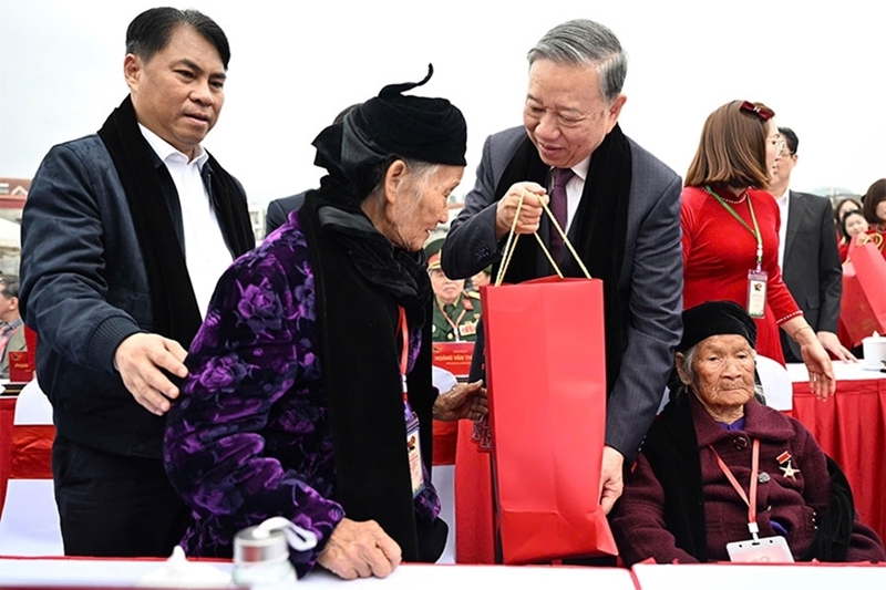 ທ່ານ ໂຕເລິມ ເລຂາທິການໃຫຍ່ ພ້ອມດ້ວຍບັນດາສະຫາຍການນໍາພັກ, ລັດ ມອບຂອງຂວັນໃຫ້ບັນດາຄອບຄົວເປົ້າໝາຍນະໂຍບາຍ, ຜູ້ມີຄຸນງາມຄວາມດີ, ຄອບຄົວທີ່ປະສົບຄວາມຫຍຸ້ງຍາກ ຢູ່ຕາແສງ ເຈື່ອງຮ່າ. ພາບ: qdnd.vn |