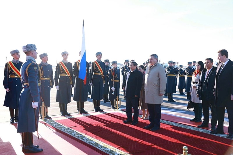 ພິທີຕ້ອນຮັບທ່ານ ຟ້າມມິງຈິງ ນາຍົກລັດຖະມົນຕີ ໄດ້ຈັດຕ້ັງຢ່າງສົມກຽດຢູ່ສະໜາມບິນສາກົນ, ນໍາໂດຍທ່ານ Rudenko Andrey ຮອງລັດຖະມົນຕີກະຊວງການຕ່າງປະເທດ ເປັນປະທານພິທີ.