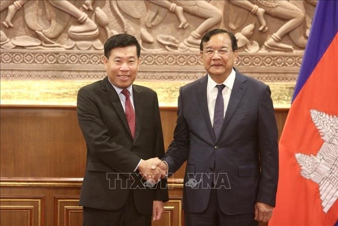 ທ່ານ Prak Sokhonn, ຮອງນາຍົກລັດຖະມົນຕີ, ລັດຖະມົນຕີກະຊວງການຕ່າງປະເທດ ແລະຮ່ວມມືສາກົນກຳປູເຈຍ (ເບື້ອງຂວາ) ຕ້ອນຮັບທ່ານ ຫງວຽນແມ້ງເກື່ອງ, ຮອງລັດຖະມົນຕີກະຊວງການຕ່າງປະເທດຫວຽດນາມ ມາເຂົ້າຢ້ຽມຂໍ່ານັບ. ພາບ: ສໍານັກຂ່າວສານຫວຽດນາມ |