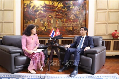 ທ່ານ ຟ້າມຫວຽດຮຸ່ງ ເອກອັກຄະລັດຖະທູດຫວຽດນາມ ປະຈຳ ໄທ (ເບື້ອງຂວາ) ຕອບສໍາພາດຕໍ່ນັກຂ່າວສໍານັກຂ່າວສານຫວຽດນາມ ປະຈໍາ ໄທ. ພາບ: ສໍານັກຂ່າວສານຫວຽດນາມ |