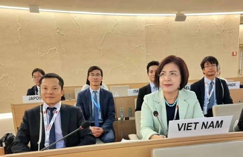 ທ່ານນາງ ເລທິຕວ໊ຽດມາຍ ເອກອັກຄະລັດຖະທູດ ແລະຄະນະຜູ້ຕາງໜ້າຫວຽດນາມ ໃນປີທຳອິດຂອງອາຍຸການ 2023-2025 ທີ່ຫວຽດນາມ ໄດ້ຮັບຕຳແໜ່ງເປັນສະມາຊິກສະພາສິດທິມະນຸດ. ພາບ: baoquocte.vn |