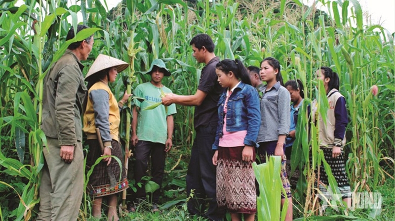 ທີມງານກໍ່ສ້າງຮາກຖານຂອງບໍລິສັດ 705 ແນະນຳເຕັກນິກການບົວລະບັດຕົ້ນໄມ້ໃຫ້ຊາວບ້ານ ນາຫຼວງ ເມືອງໂພນທອງ ແຂວງຫຼວງພະບາງ. ພາບ: qdnd.vn |