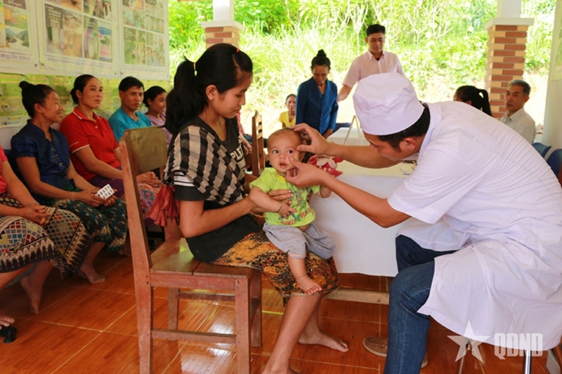 ແພດທະຫານຂອງບໍລິສັດ 705 ກວດ ແລະປິ່ນປົວພະຍາດ, ແຈກຢາຍຢາໂດຍບໍ່ເສຍຄ່າໃຫ້ແກ່ຄອບຄົວເປົ້າໝາຍນະໂຍບາຍ ແລະປະຊາຊົນ ຢູ່ບໍລິເວນທ້ອງຖິ່ນ. ພາບ: qdnd.vn |