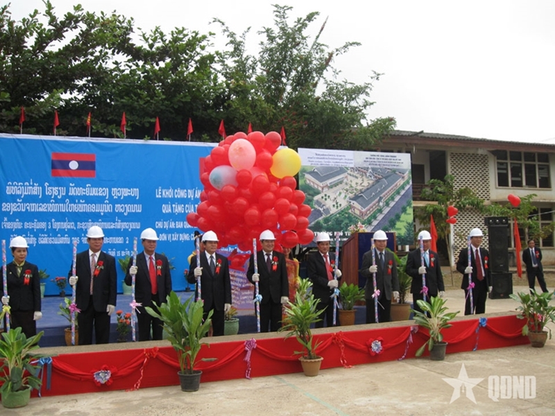 ຜູ້ຕາງໜ້າບໍລິສັດ 705 ແລະອຳນາດການປົກຄອງທ້ອງຖິ່ນ ປະຕິບັດພິທີເລີ່ມລົງມືກໍ່ສ້າງໂຮງຮຽນ ຢູ່ແຂວງຫຼວງພະບາງ. ພາບ: qdnd.vn |