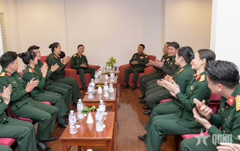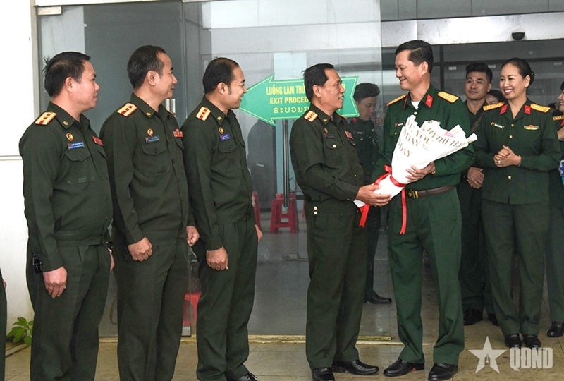 ທ່ານພົນຈັດຕະວາ ແກ້ວສຸວັນ ຜາງພິລາວົງ, ຫົວໜ້າກົມໂຄສະນາອົບຮົມ, ກົມໃຫຍ່ການເມືອງ ກອງທັບປະຊາຊົນລາວ ຕ້ອນຮັບຄະນະປະຕິບັດງານທະຫານເຂດ 1 ທີ່ນະຄອນຫຼວງວຽງຈັນ. ພາບ: qdnd.vn |