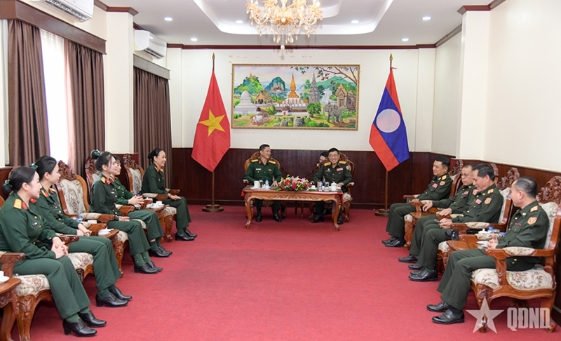 ບັນດາສະຫາຍການນໍາກົມໃຫຍ່ການເມືອງກອງທັບປະຊາຊົນລາວ ພ້ອມດ້ວຍຄະນະປະຕິບັດງານທະຫານເຂດ 1. ພາບ: qdnd.vn |