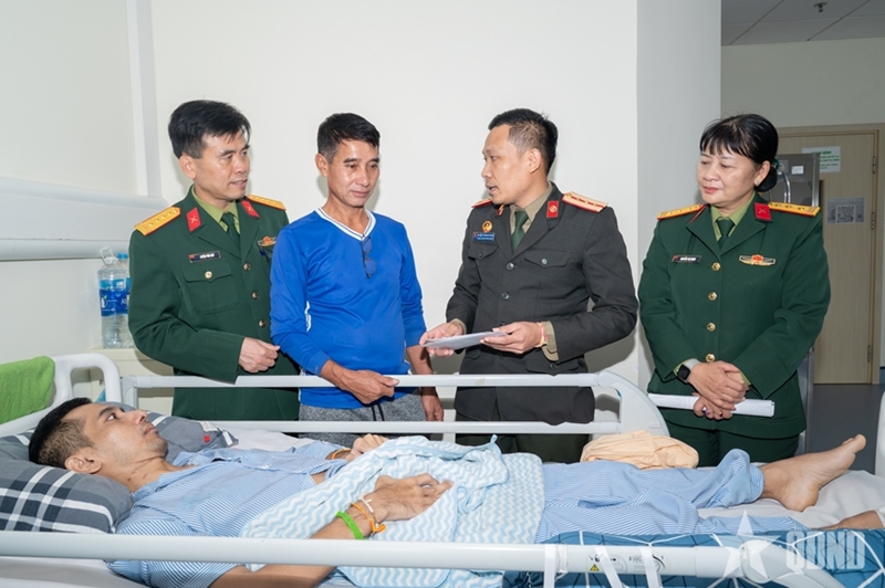 ທ່ານພັນເອກພິເສດ ລວ໊ຽນວັນກຸ໋ຍ ພະນັກງານການເມືອງ ພະແນກບໍາລຸງສ້າງນັກຮຽນສາກົນ, ວິທະຍາຄານການເມືອງ ຢ້ຽມຢາມຖາມຂ່າວ, ລະດົມກໍາລັງໃຈຍາດຕິພີ່ນ້ອງຂອງຄົນເຈັບ. ພາບ: qdnd.vn |