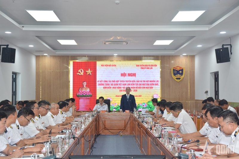 ທ່ານພົນຈັດຕະວາ ຫງວຽນຫຶວທວານ ເລຂາຄະນະພັກ, ຫົວໜ້າການເມືອງວິທະຍາຄານທະຫານເຮືອ ແລະທ່ານ ເຈິ່ນມິງຈິ້ ຮອງຫົວໜ້າຄະນະໂຄສະນາສຶກສາ ແລະຂົນຂວາຍປະຊາຊົນຄະນະພັກແຂວງດັກລັກ ເປັນປະທານຮ່ວມກອງປະຊຸມ.