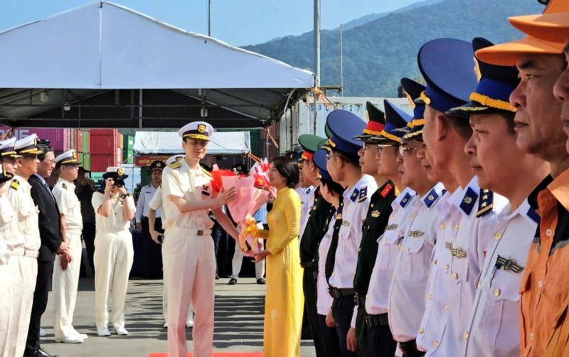 ພິທີຕ້ອນຮັບທີ່ທ່າກໍາປັ່ນຕຽນຊາ ມີຜູ້ຕາງໜ້າການນໍາພະແນກການຕ່າງປະເທດນະຄອນດ່ານັງ, ກອງບັນຊາການຕໍາຫຼວດທະເລເຂດ 2, ກອງບັນຊາການທະຫານນະຄອນດ່ານັງ, ຜູ້ຕາງໜ້າກົມພົວພັນຕ່າງປະເທດ (ກະຊວງປ້ອງກັນປະເທດ)...