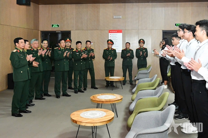 ທ່ານພົນເອກ ຟານວັນຢາງ, ລັດຖະມົນຕີກະຊວງປ້ອງກັນປະເທດຫວຽດນາມ ພ້ອມດ້ວຍຄະນະປະຕິບັດງານຢ້ຽມຢາມວິທະຍາຄານ Viettel. ພາບ: ເລເຟືອງ |