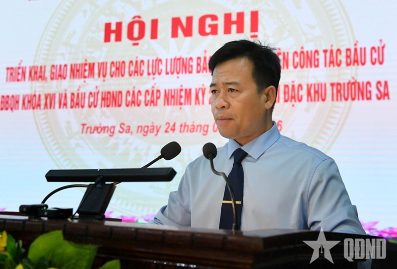 ທ່ານ ຟ້າມແທັງລຽມ ປະທານຄະນະກໍາມະການປະຊາຊົນເຂດພິເສດເຈື່ອງຊາ ລາຍງານວຽກງານກະກຽມການເລືອກຕັ້ງ ຢູ່ເຈື່ອງຊາ ທີ່ກອງປະຊຸມ. ພາບ: qdnd.vn |