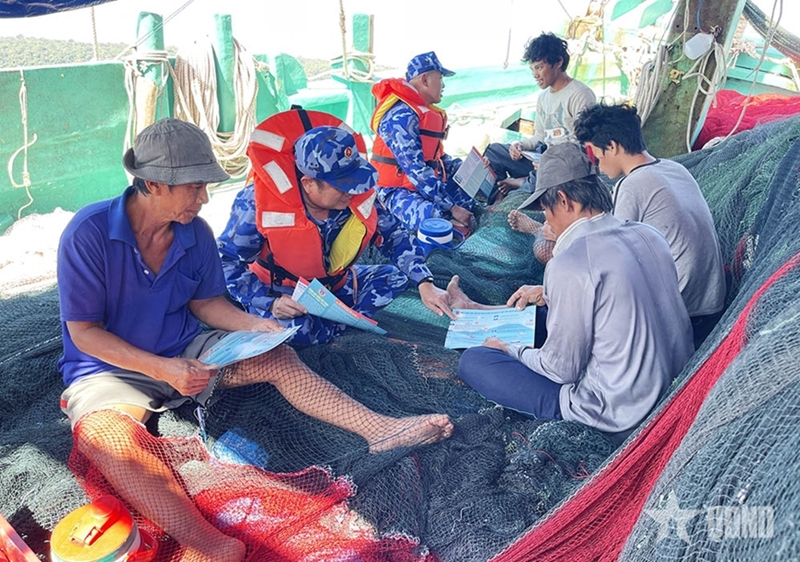 ພະນັກງານ, ນັກຮົບຕໍາຫຼວດທະເລເຂດ 3 ໂຄສະນາເຜີຍແຜ່ກົດໝາຍໃຫ້ຊາວປະມົງ. ພາບ: qdnd.vn |