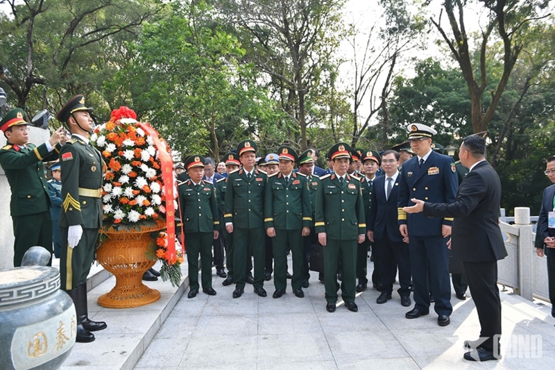 ພົນເອກ ຟານວັນຢາງ ແລະພົນໂທ ຕົງ ຈຸ່ນ ພ້ອມດ້ວຍຄະນະຜູ້ແທນໄດ້ວາງພວງມາລາທີ່ອະນຸສາວະລີນັກຮົບເສຍສະຫຼະຊີວິດເພື່ອຊາດປະຕິວັດປະຊາຊົນ ຫວຽດນາມ-ຈີນ; ກົ້ມຫົວໄວ້ອາໄລໜຶ່ງນາທີ ເພື່ອອາໄລຫານັກຮົບເສຍສະຫຼະຊີວິດເພື່ອຊາດ.