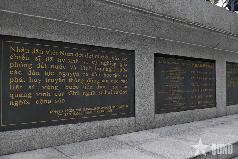 ຄະນະຜູ້ແທນໄດ້ສະແດງຄວາມສະເທືອນໃຈຕໍ່ໜ້າສິລາຈາລຶກທີ່ອະນຸສາວະລີ ທີ່ຈາລຶກຊື່ນັກຮົບເສຍສະຫຼະຊີວິດເພື່ອຊາດປະຕິວັດປະຊາຊົນ. ສິລາຈາລຶກ ຕັ້ງຢູ່ສວນສາທາລະນະມິດຕະພາບປະຊາຊົນຫວຽດນາມ-ຈີນ ທີ່ນະຄອນ ດົງຊິງ, ປະເທດຈີນ, ເຊິ່ງກວມເອົາເນື້ອທີ່ຫຼາຍກວ່າ 10 ໄລ່ (ປະມານ 6.700 ຕາແມັດ), ໄດ້ຮັບການກໍ່ສ້າງ ເພື່ອແນໃສ່ອາໄລຫານັກຮົບເສຍສະຫຼະຊີວິດເພື່ອຊາດປະຕິວັດຂອງສອງປະເທດ ຫວຽດນາມ ແລະ ຈີນ. ນີ້ແມ່ນໜຶ່ງໃນສະຖານທີ່ສຶກສາອົບຮົມນໍ້າໃຈຮັກຊາດແຫ່ງທຳອິດຂອງເຂດປົກຄອງຕົນເອງ ຊົນເຜົ່າຈ້ວງ ກວາງຊີ.