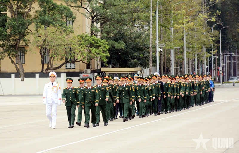 ຜູ້ແທນຊາວໝຸ່ມທີ່ພົ້ນເດັ່ນທົ່ວກອງທັບເເຂົ້າສຸສານໄວ້ອາໄລປະທານ ໂຮ່ຈີມິນ. ພາບ: qdnd.vn |