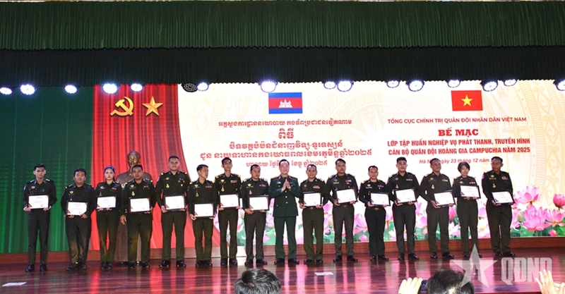 ກປ.ອອນໄລ - ຕອນບ່າຍວັນທີ 23 ທັນວາ, ທີ່ຮ່າໂນ້ຍ, ສູນກະຈາຍສຽງ-ໂທລະພາບກອງທັບ ໄດ້ຈັດພິທີປິດຊຸດຝຶກອົບຮົມວຽກງານກະຈາຍສຽງ, ໂທລະພາບໃຫ້ແກ່ພະນັກງານກອງທັບ ແຫ່ງລາຊະອານາຈັກ ກຳປູເຈຍ ປີ 2025.
