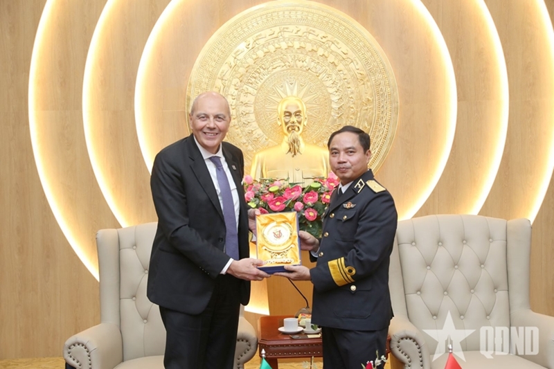 ທ່ານພົນຈັດຕະວາ ຫງວຽນວັນແບກ ຮອງຜູ້ບັນຊາການ, ຫົວໜ້າເສນາທິການເຫຼົ່າທັບເຮືອ, ຮອງປະທານຄະນະກໍາມະການອຸທົກກະສາດຫວຽດນາມ ມອບຂອງຂວັນທີ່ລະນິກໃຫ້ທ່ານພົນຈັດຕະວາ Luigi Sinapi, ຜູ້ອຳນວຍການອົງການອຸທົກກະສາດສາກົນ (IHO). ພາບ: qdnd.vn |