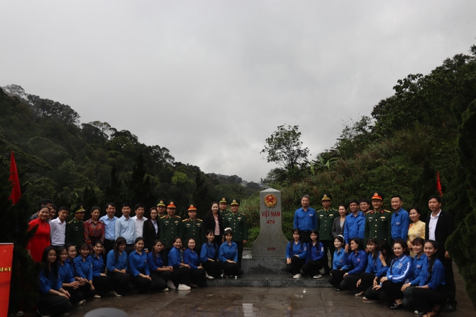 ຜູ້ແທນ ແລະສະມາຊິກຊາວໜຸ່ມຖ່າຍຮູບເປັນທີ່ລະນຶກທີ່ຫຼັກໝາຍຊາຍແດນເລກ 476 ຢູ່ເສັ້ນຊາຍແດນ ຫວຽດນາມ-ລາວ. ພາບ: baotintuc.vn |