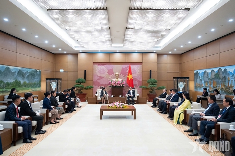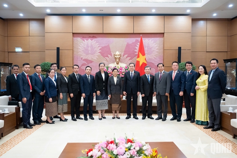 ທ່ານ ເຈິ່ນແທັງເໝິນ ປະທານສະພາແຫ່ງຊາດຫວຽດນາມ ແລະທ່ານນາງ ວຽງທອງ ສີພັນດອນ ປະທານສານປະຊາຊົນສູງສຸດລາວ ພ້ອມດ້ວຍບັນດາຜູ້ແທນ. ພາບ: qdnd.vn |