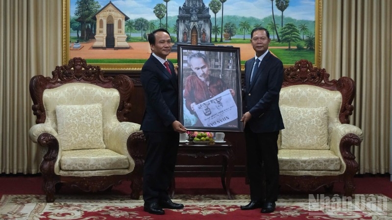 | ສະຫາຍ ຫງວຽນດິ່ງວິ້ງ ຮອງເລຂາຜູ້ປະຈໍາການຄະນະພັກນະຄອນດ່ານັງ ມອບຮູບພາບລຸງໂຮ່ ອ່ານໜັງສືພິມປະຊາຊົນ ໃຫ້ການນຳແຂວງສະຫວັນນະເຂດ. ພາບ: ແອັງດ່າວ |