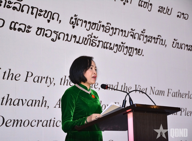 ທ່ານນາງ ຄໍາເພົາ ເອີນທະວັນ ເອກອັກຄະລັດຖະທູດລາວ ປະຈໍາ ຫວຽດນາມ ກ່າວຄຳເຫັນທີ່ງານລ້ຽງ. ພາບ: qdnd.vn |