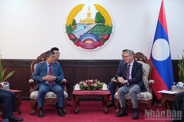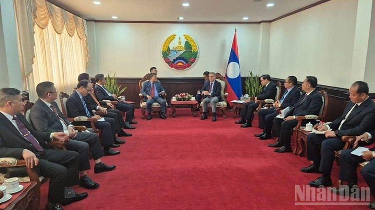 ທ່ານ ທອງສະຫວັນ ພົມວິຫານ ລັດຖະມົນຕີກະຊວງການຕ່າງປະເທດລາວ ຕ້ອນຮັບທ່ານ ຫງວຽນມິງຫວູ ຮອງລັດຖະມົນຕີຜູ້ປະຈໍາການກະຊວງການຕ່າງປະເທດຫວຽດນາມ ພ້ອມດ້ວຍຄະນະຜູ້ແທນຊາຍແດນຫວຽດນາມ. ພາບ: nhandan.vn |