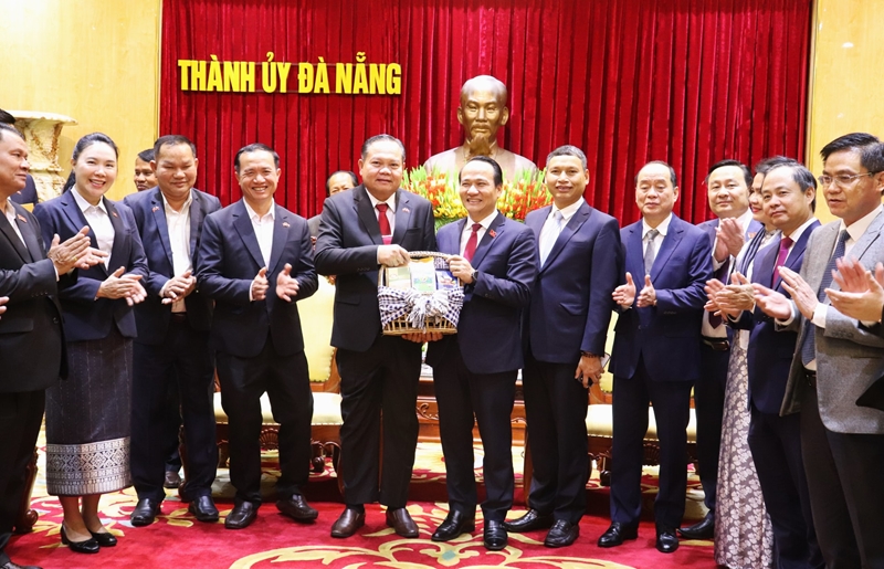 ທ່ານ ຫງວຽນດິ່ງວີງ ຮອງເລຂາຜູ້ປະຈໍາການພັກນະຄອນດ່າໜັ້ງ (ເບື້ອງຂວາ) ມອບຂອງຂວັນທີ່ລະນຶກໃຫ້ແກ່ທ່ານ ສຸພາບ ທໍາມະຮັກສາ ຮອງເລຂາພັກແຂວງຈໍາປາສັກ. ພາບ: ງອັກຮ່າ |
