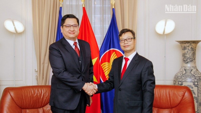 ທ່ານ ຈິ້ງດຶ໊ກຫ໋າຍ ເອກອັກຄະລັດຖະທູດຫວຽດນາມ ປະຈໍາ ຝຣັ່ງ ແລະທ່ານ ກາລາມຸງຄຸນ ສຸພານຸວົງ ເອກອັກຄະລັດຖະທູດລາວ ປະຈໍາ ຝຣັ່ງ. ພາບ: nhandan.vn |