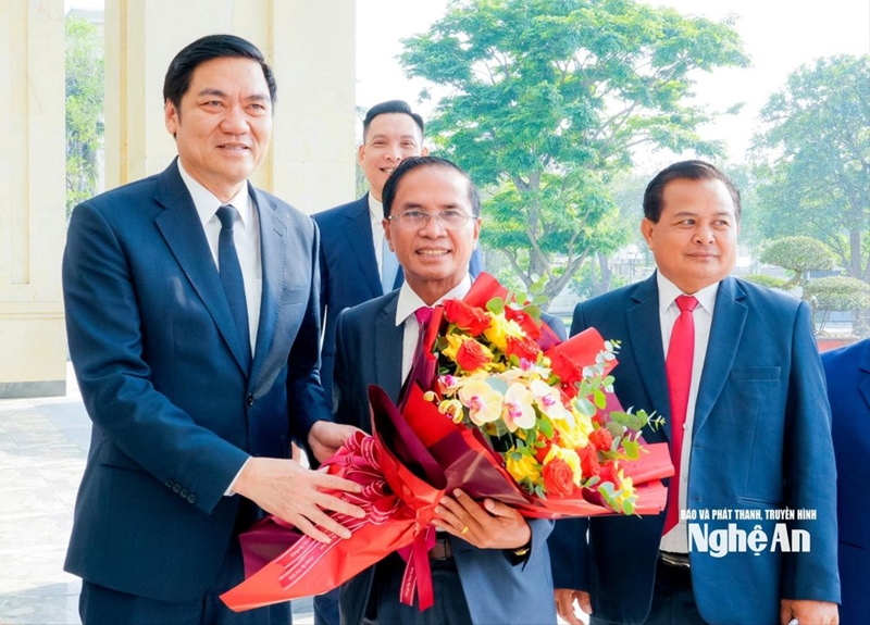 ສະຫາຍ ຮວ່າງເຫງຍຮ໊ຽວ, ຮອງເລຂາຜູ້ປະຈໍາການຄະນະພັກແຂວງ, ປະທານສະພາປະຊາຊົນແຂວງເງະອານ ມອບຊໍ່ດອກໄມ້, ຊົມເຊີຍສະຫາຍ ສີເຮັ່ງ ຫອມສົມບັດ, ປະທານສະພາປະຊາຊົນແຂວງສາລະວັນ ແລະຄະນະມາຢ້ຽມຢາມ ແລະເຮັດວຽກຢູ່ ແຂວງເງະອານ. ພາບ: ຟ້າມບັ່ງ |