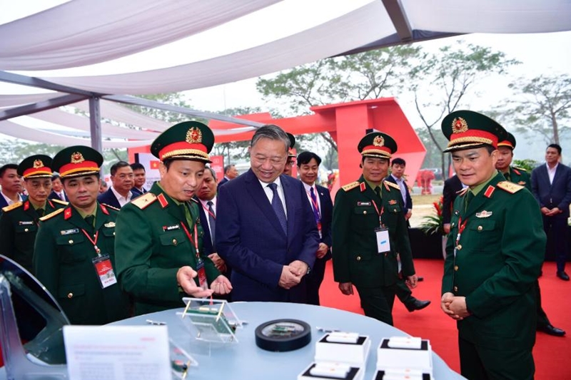 ທ່ານ ໂຕເລິມ ເລຂາທິການໃຫຍ່ ແລະຜູ້ແທນເຂົ້າຮ່ວມຢ້ຽມຊົມຜະລິດຕະພັນແຜງວົງຈອນພິມເອເລັກໂຕນິກເຕັກໂນໂລຢີສູງຂອງ Viettel. ພາບ: ດວ່ານບັກ |