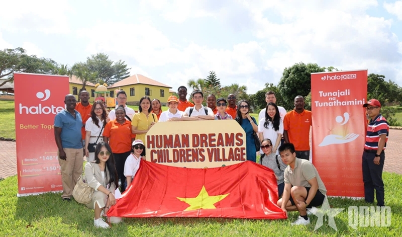 ທຸງຊາດຫວຽດນາມ ແລະ ທຸງຊາດ ຕານຊາເນຍ ປະກົດຢູ່ພື້ນຫຼັງຂອງເຫດການຄວາມຮັບຜິດຊອບຕໍ່ສັງຄົມ ໂດຍ Halotel ສົມທົບກັບສະຖານທູດຫວຽດນາມຈັດຂຶ້ນ ເພື່ອມອບຂອງຂວັນໃຫ້ເດັກນ້ອຍ. ພາບ: qdnd.vn |