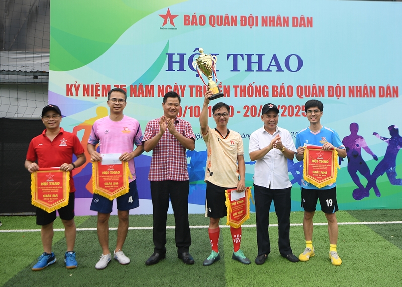 ການນໍາຄະນະບັນນາທິການໜັງສືພິມກອງທັບປະຊາຊົນຫວຽດນາມ ມອບລາງວັນກິລາບານເຕະ. ພາບ: qdnd.vn |