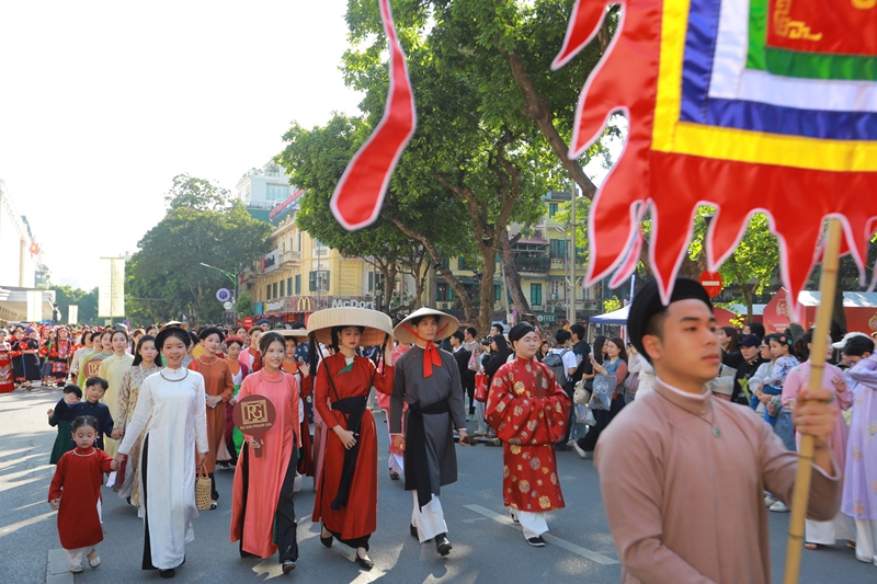 ລາຍການແຫ່ຂະບວນຊຸດອາພອນຫວຽດນາມ ໃນງານບຸນເຄື່ອງນຸ່ງພື້ນເມືອງຫວຽດນາມ “ແບກຮວາ ໂບ້ແຮ່ງ” ເຊິ່ງໄດ້ຈັດຕັ້ງອ້ອມໜອງ ຮວ່ານກ໋ຽມ (ຮ່າໂນ້ຍ), ເດືອນພະຈິກ 2025. ພາບ: ແຄ໋ງຮວ່າ. |