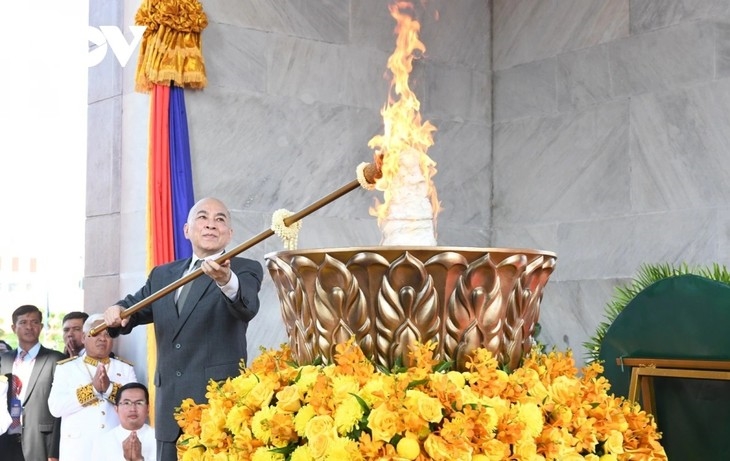 ພາຍຫຼັງພິທີເຄົາລົບທຸງຊາດ, ກະສັດ Norodom Sihamoni ໄດ້ວາງພວງມາລາອາໄລຫາບັນດານັກວິລະຊົນ, ນັກຮົບເສຍສະຫຼະຊີວິດເພື່ອຊາດ...