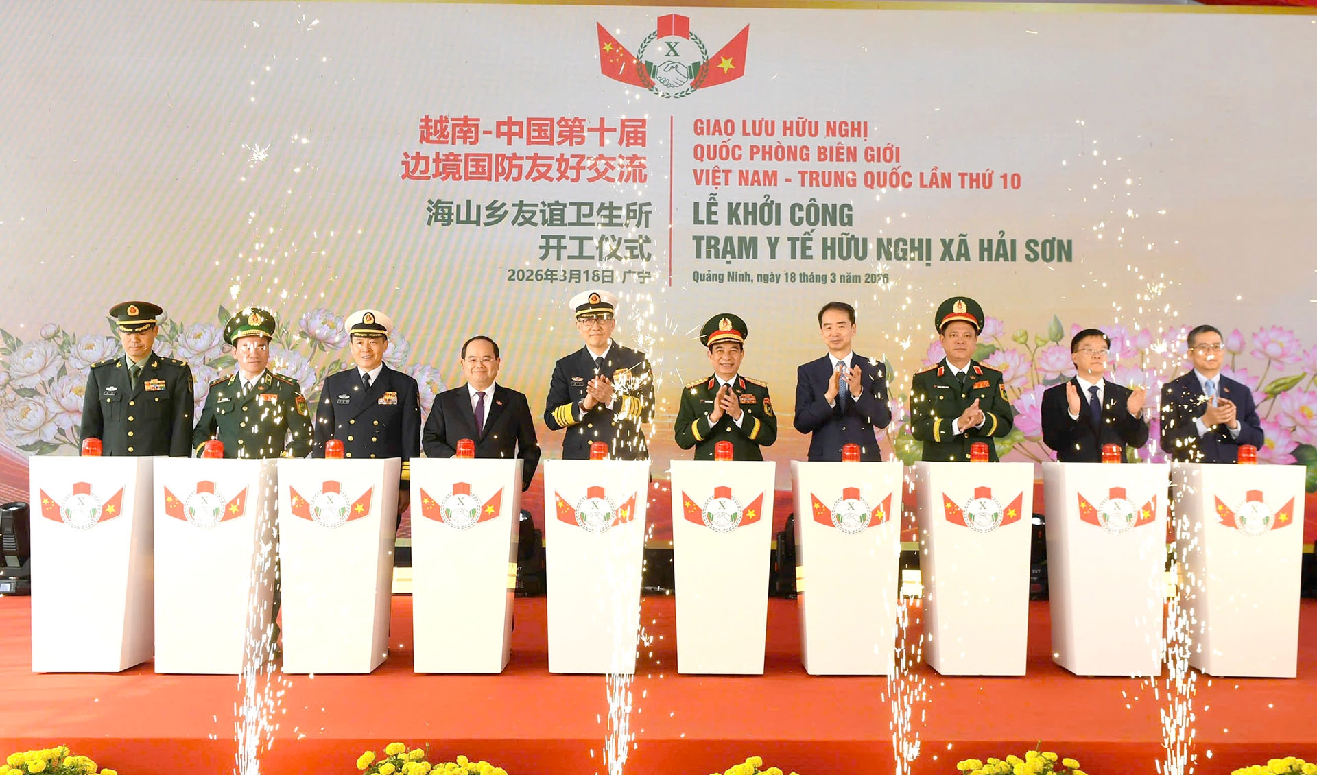 ທ່ານລັດຖະມົນຕີ ຟານວັນຢາງ ແລະທ່ານລັດຖະມົນຕີ ຕົງ ຈຸ່ນ ເຂົ້າຮ່ວມພິທີວາງສີລາລຶກສຸກສາລາມິດຕະພາບ ຕາແສງຫາຍເຊີນ, ແຂວງກວາງນິງ. ພາບ: qdnd.vn
