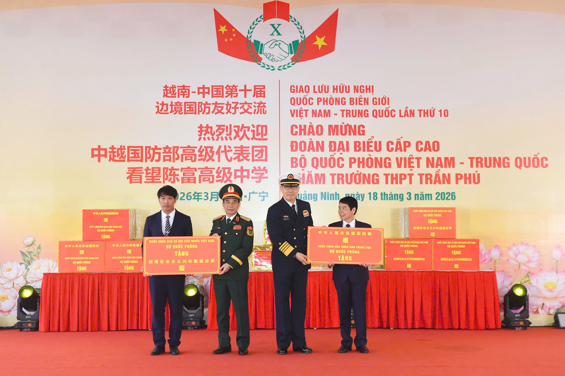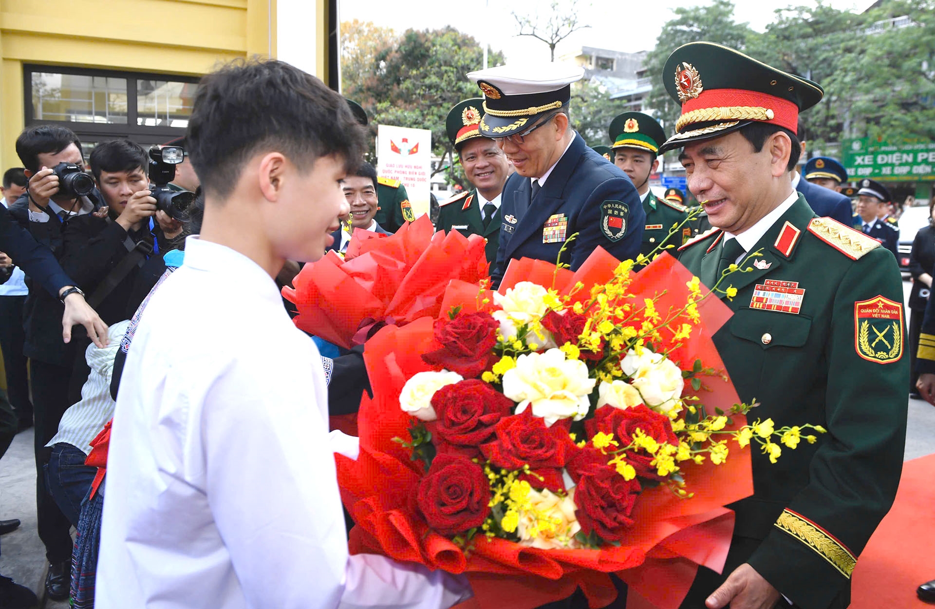 ພວກນ້ອງນັກຮຽນໂຮງຮຽນມັດທະຍົມຕອນປາຍ ເຈິ່ນຝູ, ຕາແສງມ໊ອງກ໊າຍ 2, ແຂວງກວາງນິງ ມອບຊໍ່ດອກໄມ້ໃຫ້ລັດຖະມົນຕີກະຊວງປ້ອງກັນປະເທດ ສອງປະເທດ. ພາບ: qdnd.vn