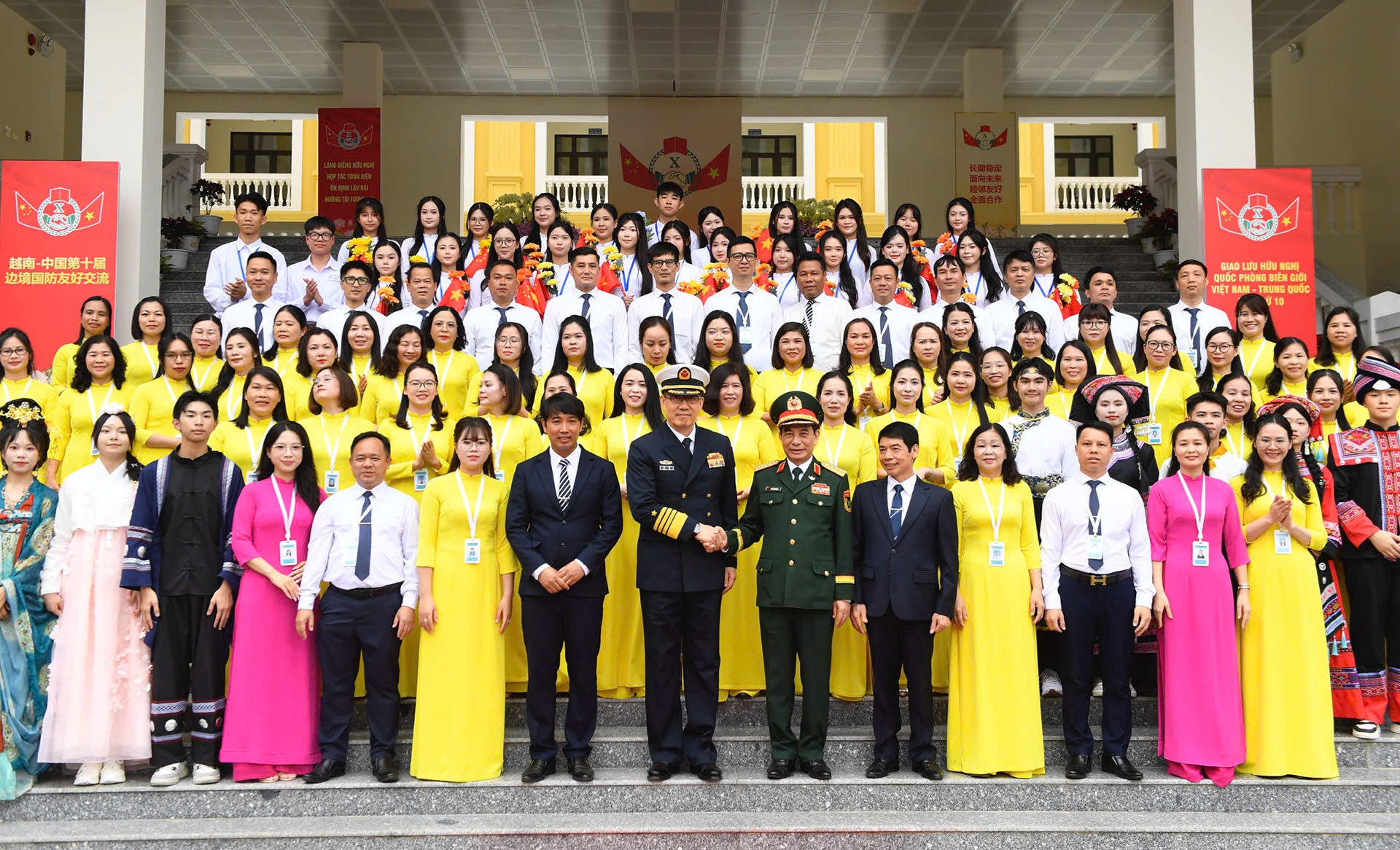 ສອງລັດຖະມົນຕີ ຖ່າຍຮູບພ້ອມກັບຄູອາຈານ ແລະນັກຮຽນໂຮງຮຽນມັດທະຍົມຕອນປາຍ ເຈິ່ນຝູ ແລະໂຮງຮຽນມັດທະຍົມ Dongxing (ນະຄອນ Dongxing, ເຂດປົກຄອງຕົນເອງ ເຜົ່າຈ້ວງ ແຂວງກວາງຊີ, ຈີນ). ພາບ: qdnd.vn