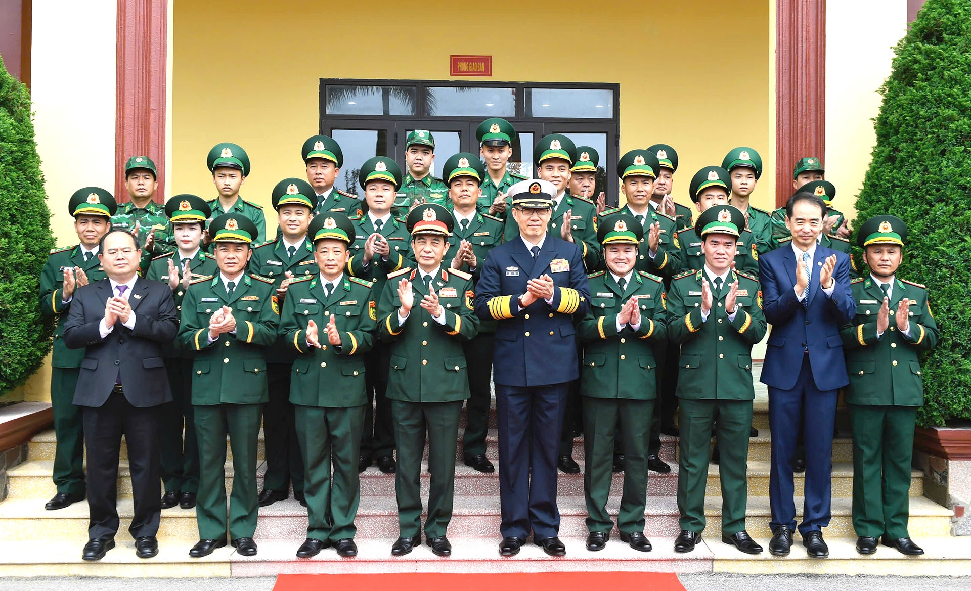 ລັດຖະມົນຕີກະຊວງປ້ອງກັນປະເທດ ສອງປະເທດ ແລະບັນດາຜູ້ແທນ ຖ່າຍຮູບລວມກັບພະນັກງານ, ນັກຮົບຄ້າຍທະຫານຊາຍແດນ ຈ່າໂກ້. ພາບ: qdnd.vn