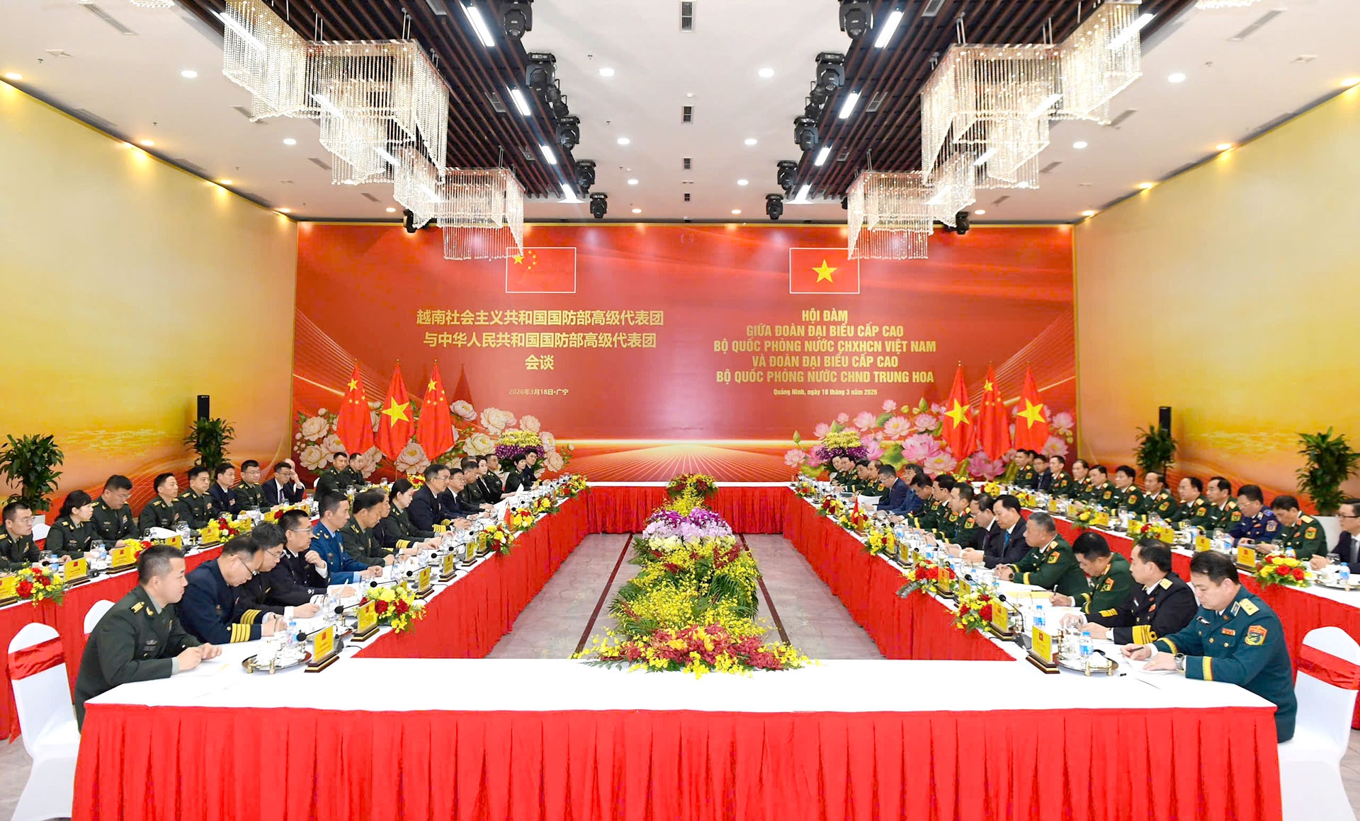 ທ່ານພົນເອກ ຟານວັນຢາງ ລັດຖະມົນຕີກະຊວງປ້ອງກັນປະເທດຫວຽດນາມ ແລະທ່ານພົນໂທ ຕົງ ຈຸ່ນ ລັດຖະມົນຕີກະຊວງປ້ອງກັນປະເທດ ແຫ່ງ ສປ ຈີນ ທີ່ພິທີຕ້ອນຮັບໃນຕອນເຊົ້າວັນທີ 18 ມີນາ. ພາບ: qdnd.vn